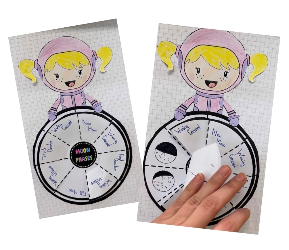 Divertido material para aprender las fases de la luna. El material consta de dos opciones: niña astronauta y niño astronauta.
